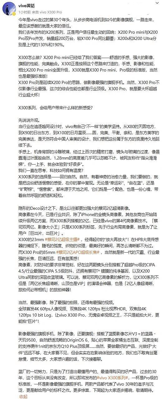 另外,日前,@vivo黄韬 发长文解读了vivo X300系列的详细参数,据其称,