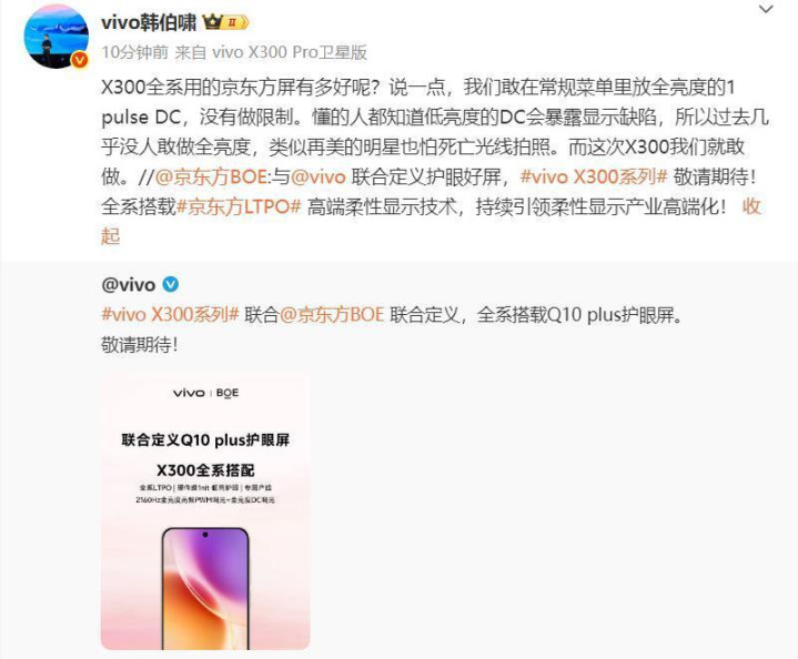 继近日,@vivo 官宣称,vivo X300系列被指定成为谢霆锋「进化」演唱会广州站的演唱会神器之后,日前,官方再次发布了该系列新机屏幕方面的预热海报,据官宣称,“#vivo X300系列# 联合@京东方BOE 联合定义,全系搭载Q10 plus护眼屏。敬请期待! ”同时,@京东方BOE 也表示,“与@vivo 联合定义护眼好屏,#vivo X300系列# 敬请期待! 全系搭载#京东方LTPO# 高端柔性显示技术,持续引领柔性显示产业高端化!”